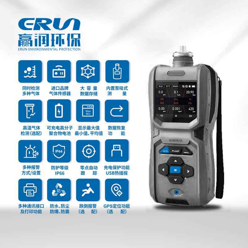 贏潤環保研發、生產的便攜式泵吸型六合一多參數氣體報警儀ERUN-PG71S6可同時檢測氧氣、甲烷、硫化氫、一氧化碳、二氧化碳、氮氧化物或其他可燃有毒氣體,也可以配備溫度、濕度測量,檢測氣體種類超過500余種。